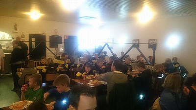 Efter det så blev det härlig kaos i pizzeria när det stormar in 50 hungriga barn, föräldrar och tränare. Det löste sig dock snabbt och smidigt.