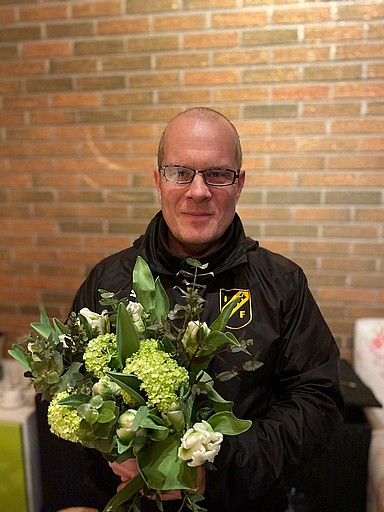 Tränare Mats Kjellander har fyllt 50-år och gratulerades efter tisdagsträningen av spelarna med blommor och present.