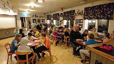 Trötta tjejer och killar äter kvällsmat och längtar efter att få träna igen ⚽