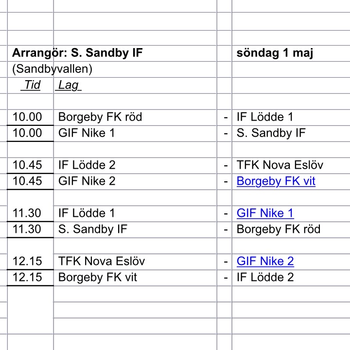 Här kommer spelschemat för den 1 maj. Vi är Lödde lag 1.