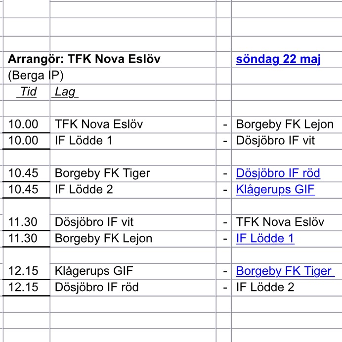 Vi är Lödde lag 1. Precis som förra gången samlas vi på IP kl 08.45. Kallelse skickas ut separat. Var beredda på att det kan behöva dubbleras i matcher med Lödde 2, så boka hela förmiddagen.